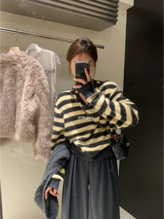 OfertaMETWO>毛條紋V領毛衣 1802#