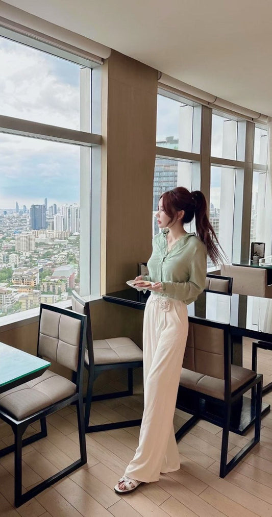 OfertaSTH 蕾絲顯白綠薄襯衫 0601#