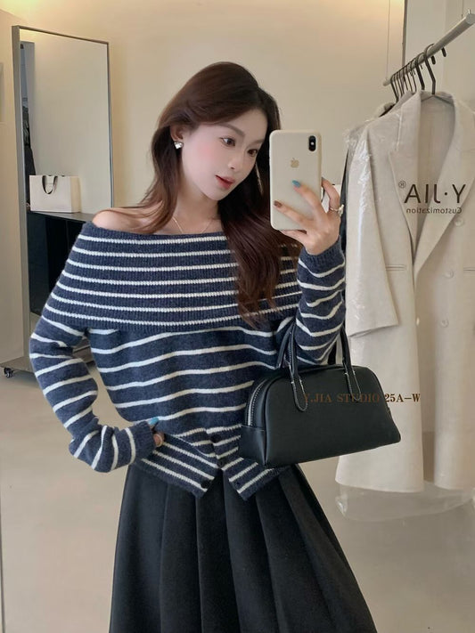 AgotadoMETWO - 假兩件條紋披肩針織衫 92401#