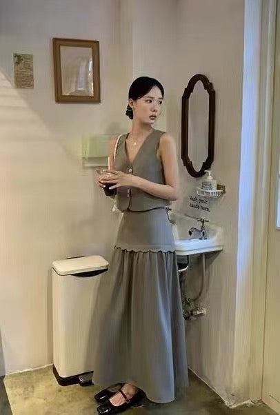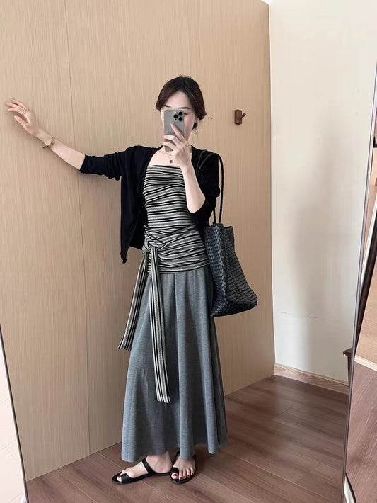 NENE - 慵懶開衫+綁帶背心+空氣棉半裙3件套 9326#