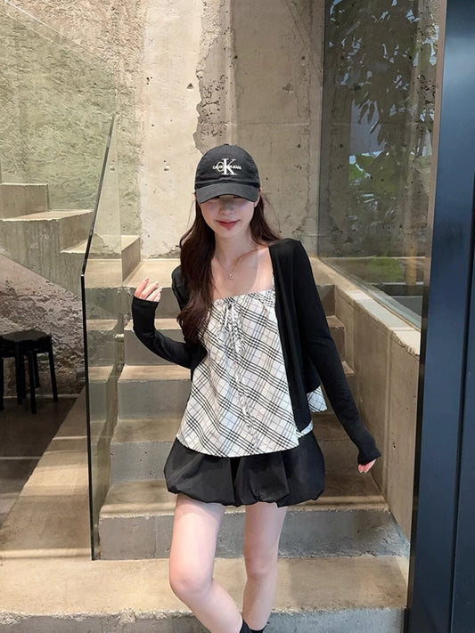 NENE> 小眾格紋三件套(吊帶+罩衫+花苞裙) 1172#