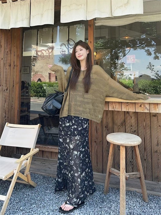 NENE> 復古簍空寬鬆針織衫+印花魚尾裙套裝 8203#