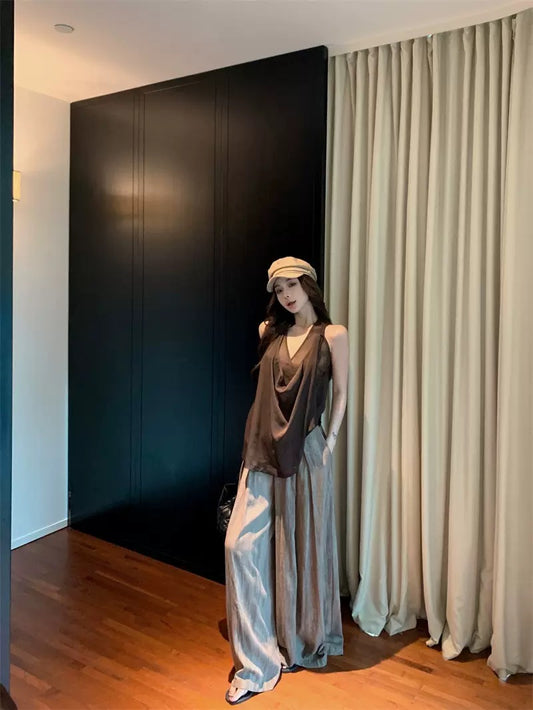 NENE - 純慾掛薄紗背心&玫瑰棕闊腿褲套裝 7736#