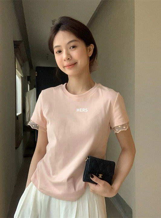Giảm giáHERS> 可愛蕾絲袖純色T 20435#