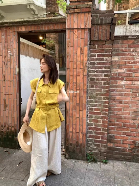 Giảm giáMETWO> 顯白色系棉麻腰帶襯衫 8271#