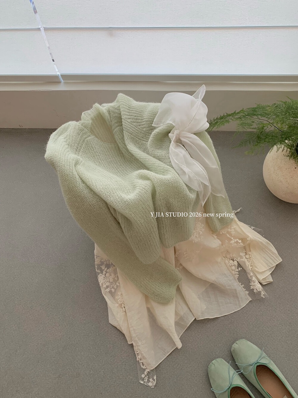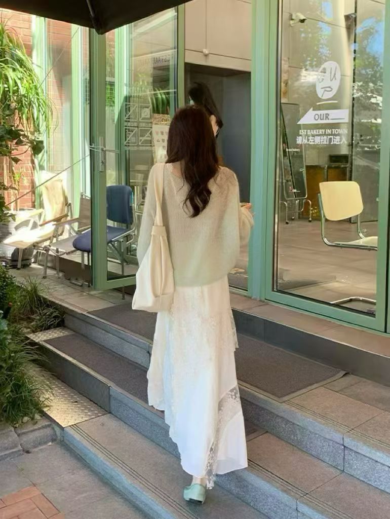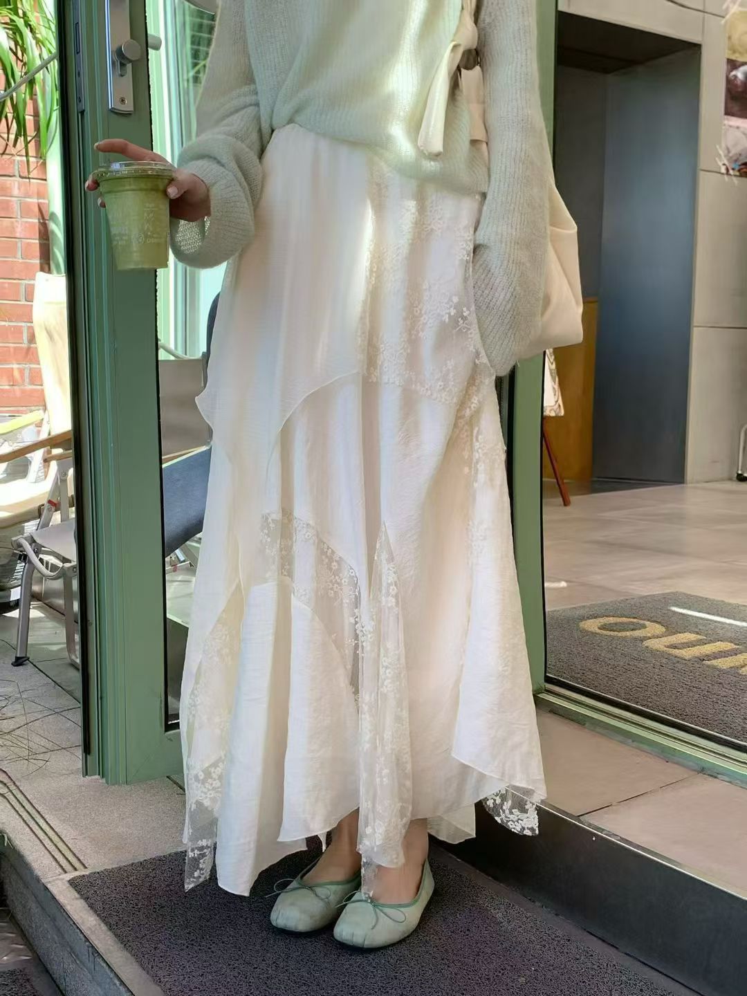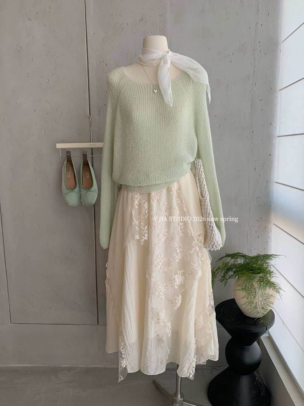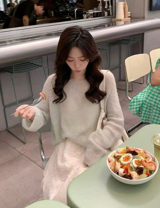 YJ - 薄荷綠柔針織蕾絲不規則半裙套裝 8806#